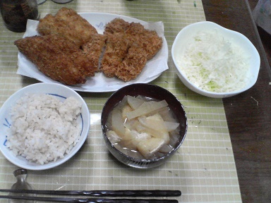 今日は揚物などを頂きます。イカフライ、白身魚フライなど、味噌汁は大根とあぶらげ、キャベツサラダも頂きます。今日もおいしく頂きました。