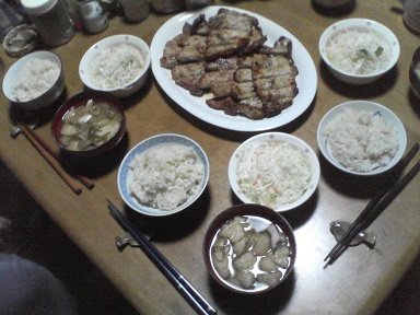 今日は豚肉などを頂きます。塩コショーとガーリックで焼いた豚肉、味噌汁は舞茸とあぶらげ、キャベツサラダも頂きます。今日もおいしく頂きました。