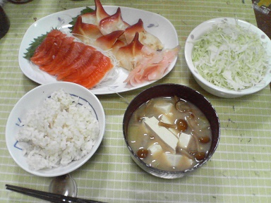 今日は刺身などを頂きます。鮭、ホッキなど・・味噌汁はナメコと豆腐、キャベツサラダも頂きます。今日もおいしく頂きました。