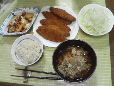 今日は白身魚フライなどを頂きます。冷凍物の白身魚フライ・・ポテトのチーズ掛け、鶏挽肉と多彩のスープ、キャベツサラダも頂きます。今日もおいしく頂きました。