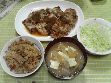 今日は豚肉などを頂きます。豚肉のソテー?大根おろしのタレで頂きます。今日は炊き込み御飯・・味噌汁は玉葱と豆腐、キャベツサラダも頂きます。今日もおいしく頂きました。