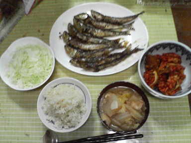 今日はイワシなどを頂きます。オリーブ油で焼いたイワシの丸干し、蒸し海鞘・・味噌汁は白菜とあぶらげ、キャベツサラダも頂きます。今日もおいしく頂きました。