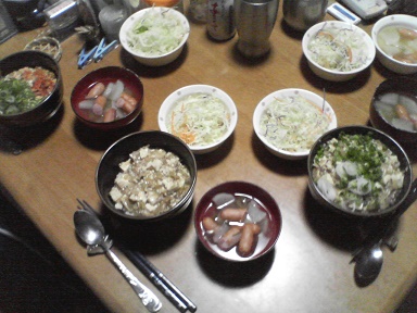 今日は炒飯などを頂きます。市販の素で炒めた色の濃い炒飯?汁物は前回の野菜スープを流用、キャベツサラダも頂きます。今日もおいしく頂きました。