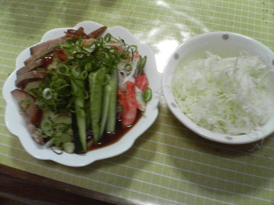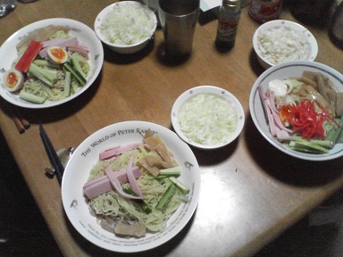 今日は冷やし中華などを頂きます。あり合わせの具材の冷やし中華?キャベツサラダも頂きます。今日もおいしく頂きました。