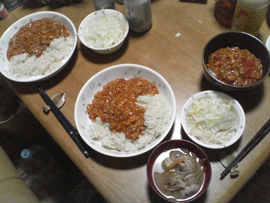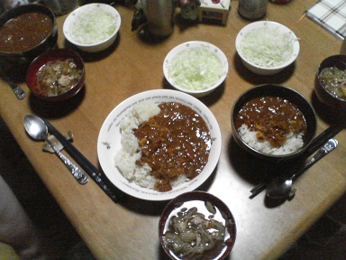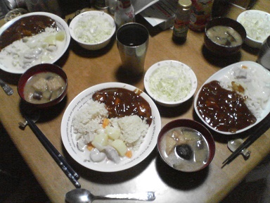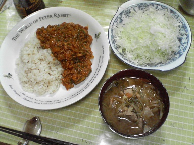 今日はカレーなどを頂きます。キーマカレーのようなもの?味噌汁は前回の豚汁のアレンジ品・・キャベツサラダも頂きます。今日もおいしく頂きました。