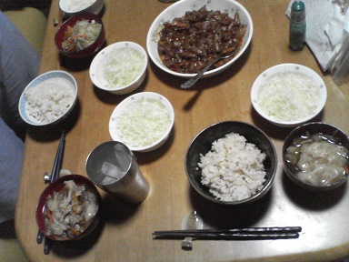 今日は豚ホルモンなどを頂きます。豚ホルモンと玉葱などを炒めて焼き肉のタレで味付けしたもの、ミックス野菜とワンタンのスープ、キャベツサラダも頂きます。今日もおいしく頂きました。