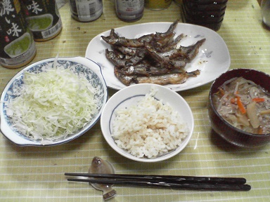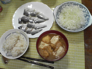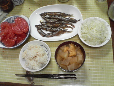 今日はシシャモなどを頂きます。オリーブ油で焼いたシシャモ、味噌汁は大根とあぶらげ、キャベツサラダも頂きます。グレープフルーツも・・今日もおいしく頂きました。