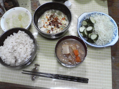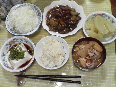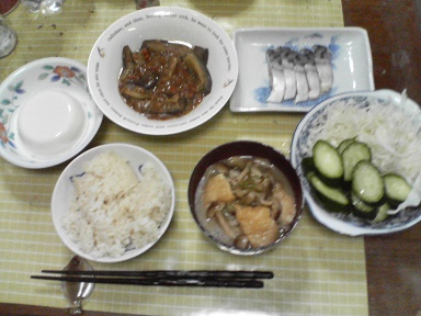 今日は麻婆茄子などを頂きます。麻婆茄子らしきもの?〆鯖も頂きます。豆腐も頂きます。味噌汁はシメジとあぶらげ、サラダも頂きます。今日もおいしく頂きました。