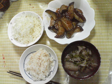 今日は茄子炒めなどを頂きます。炒めた茄子に味噌風味の市販の素をかけて頂きます。味噌汁は豆苗と舞茸とあぶらげ、キャベツサラダも頂きます。今日もおいしく頂きました。