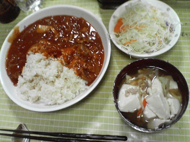 今日はハヤシライスなどを頂きます。トマトベースのハヤシライス・・汁物はコンソメベースにミックス野菜と鶏挽肉と豆腐のよくわからないもの?キャベツサラダも頂きます。今日もおいしく頂きました。