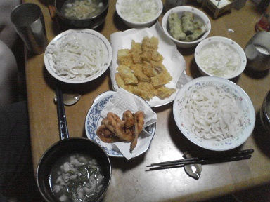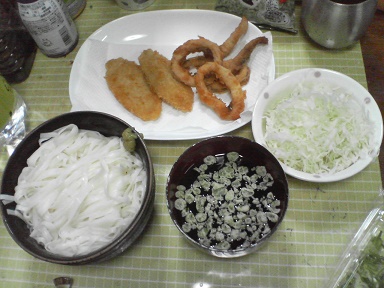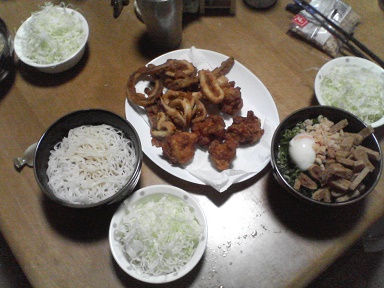 今日はそうめんなどを頂きます。水洗いだけで食べられるそうめんに好みでトッピング、おかずに揚物・・キャベツサラダも頂きます。今日もおいしく頂きました。