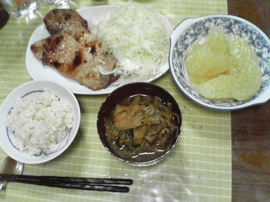 今日は豚肉などを頂きます。普通の豚肉?味噌汁は豆苗と舞茸、グレープフルーツも頂きます。今日もおいしく頂きました。