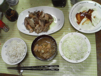 今日は鶏肉などを頂きます。鶏肉をオリーブ油で焼いて塩コショーで味付けしたもの、豆腐も頂きます。味噌汁はモヤシとあぶらげ、キャベツサラダも頂きます。今日もおいしく頂きました。