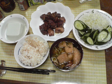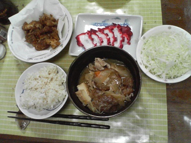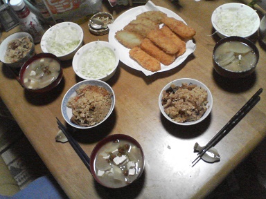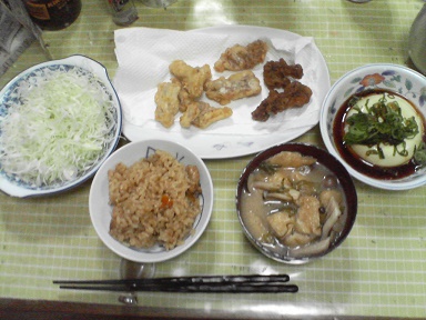 今日は揚物などを頂きます。あり合わせの揚物、鶏天とイカの揚物・・豆腐も頂きます。今日は炊き込み御飯、味噌汁はシメジとあぶらげ、キャベツサラダも頂きます。今日もおいしく頂きました。