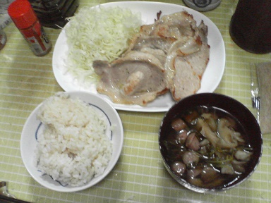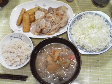 今日は豚肉などを頂きます。豚肉とポテト、味噌汁は豚汁風?キャベツサラダも頂きます。今日もおいしく頂きました。