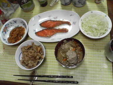今日はシャケなどを頂きます。オリーブ油で焼いた甘塩のシャケ、今日は炊き込み御飯、生姜の漬物、味噌汁はミックス野菜とつみれ、キャベツサラダも頂きます。今日もおいしく頂きました。