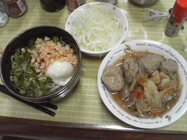 今日はそばなどを頂きます。冷しそばに温玉と揚げ玉などをトッピング、つみれの味噌汁・・キャベツサラダも頂きます。今日もおいしく頂きました。