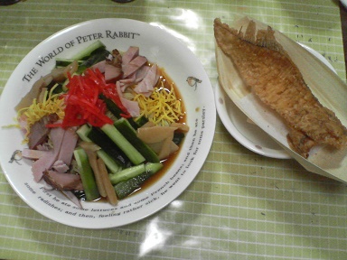 今日は冷やし中華などを頂きます。普通の冷やし中華?カレイの縁側の唐揚げ・・今日もおいしく頂きました。