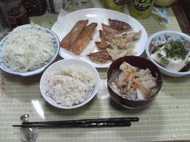 今日は餃子と春巻などを頂きます。餃子と春巻、豆腐も頂きます。汁物はミックス野菜と豆腐のスープ、キャベツサラダも頂きます。今日もおいしく頂きました。