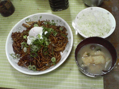今日は焼そばなどを頂きます。ソース焼きそばに温玉をトッピング・・味噌汁はシメジと豆苗とあぶらげ、キャベツサラダも頂きます。今日もおいしく頂きました。
