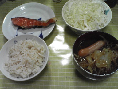 今日はシャケなどを頂きますオリーブ油で焼いたシャケ、汁物はミックス野菜とソーセージのスープ、キャベツサラダも頂きます。今日もおいしく頂きました。