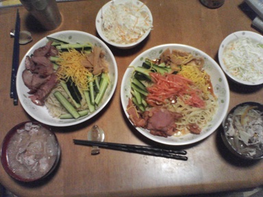 今日は冷やし中華などを頂きます。ありあわせの具材の冷やし中華、汁物は豚肉とミックス野菜の豚汁風?キャベツサラダも頂きます。今日もおいしく頂きました。
