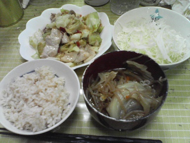 今日は炒め物などを頂きます。豚肉、玉葱、ピーマンなどを炒め、中華ダシとガーリックで味付けしたもの、味噌汁はミックス野菜とあぶらげ、キャベツサラダも頂きます。今日もおいしく頂きました。