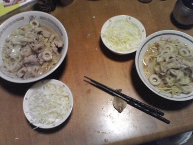 今日はラーメンなどを頂きます。ありあわせの具材のチャンポン風?キャベツサラダも頂きます。今日もおいしく頂きました。