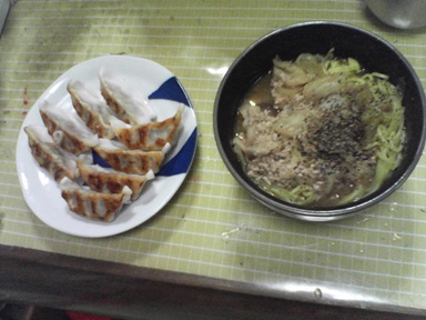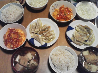 今日は餃子などを頂きます。肉餃子・・卵にチリソースで味付けしたもの、汁物は揚げ豆腐とネギを麺つゆで煮たもの、キャベツサラダも頂きます。今日もおいしく頂きました。