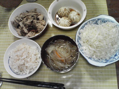 今日は小籠包などを頂きます。市販の小籠包、茄子炒めも頂きます。味噌汁はミックス野菜とあぶらげ、キャベツサラダも頂きます。今日もおいしく頂きました。