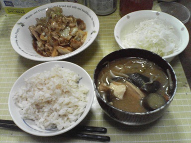今日は茄子炒めなどを頂きます。茄子を市販の素で炒めたもの、汁物は前回の味噌汁を流用、キャベツサラダも頂きます。今日もおいしく頂きました。