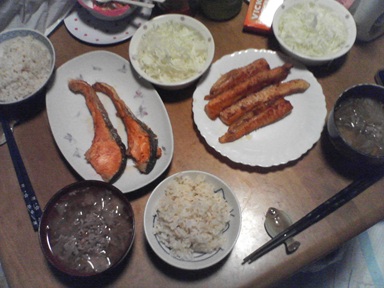今日はシャケなどを頂きます。シャケの粕漬・・麻婆茄子が余っていたので頂きます。味噌汁は茄子とあぶらげ、キャベツサラダも頂きます。今日もおいしく頂きました。
