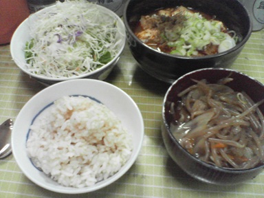 今日は麻婆豆腐などを頂きます。辛口の麻婆豆腐、汁物は前回のスープのアレンジ品、キャベツサラダも頂きます。今日もおいしく頂きました。