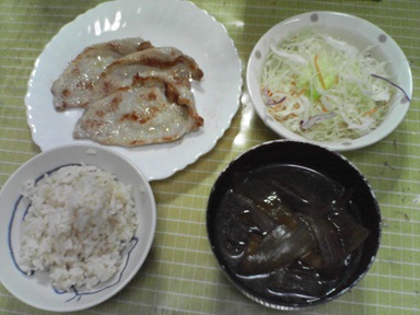 今日は豚肉などを頂きます。普通の豚肉?汁物は玉葱のスープ、キャベツサラダも頂きます。今日もおいしく頂きました。