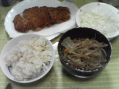 今日はカツなどを頂きます。市販のトンカツ・・汁物はミックス野菜のスープ、キャベツサラダも頂きます。今日もおいしく頂きました。