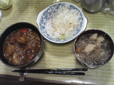 今日はカレーなどを頂きます。カレー丼・・汁物は鶏皮とミックス野菜のスープ、キャベツサラダも頂きます。今日もおいしく頂きました。