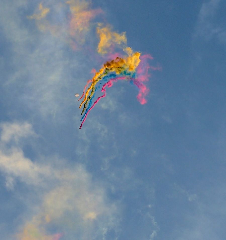 通常の花火の燃焼とは違い、上の画像のように色けむりのパイプを吊るした落下傘を仕込んだもの(煙竜)もあります。