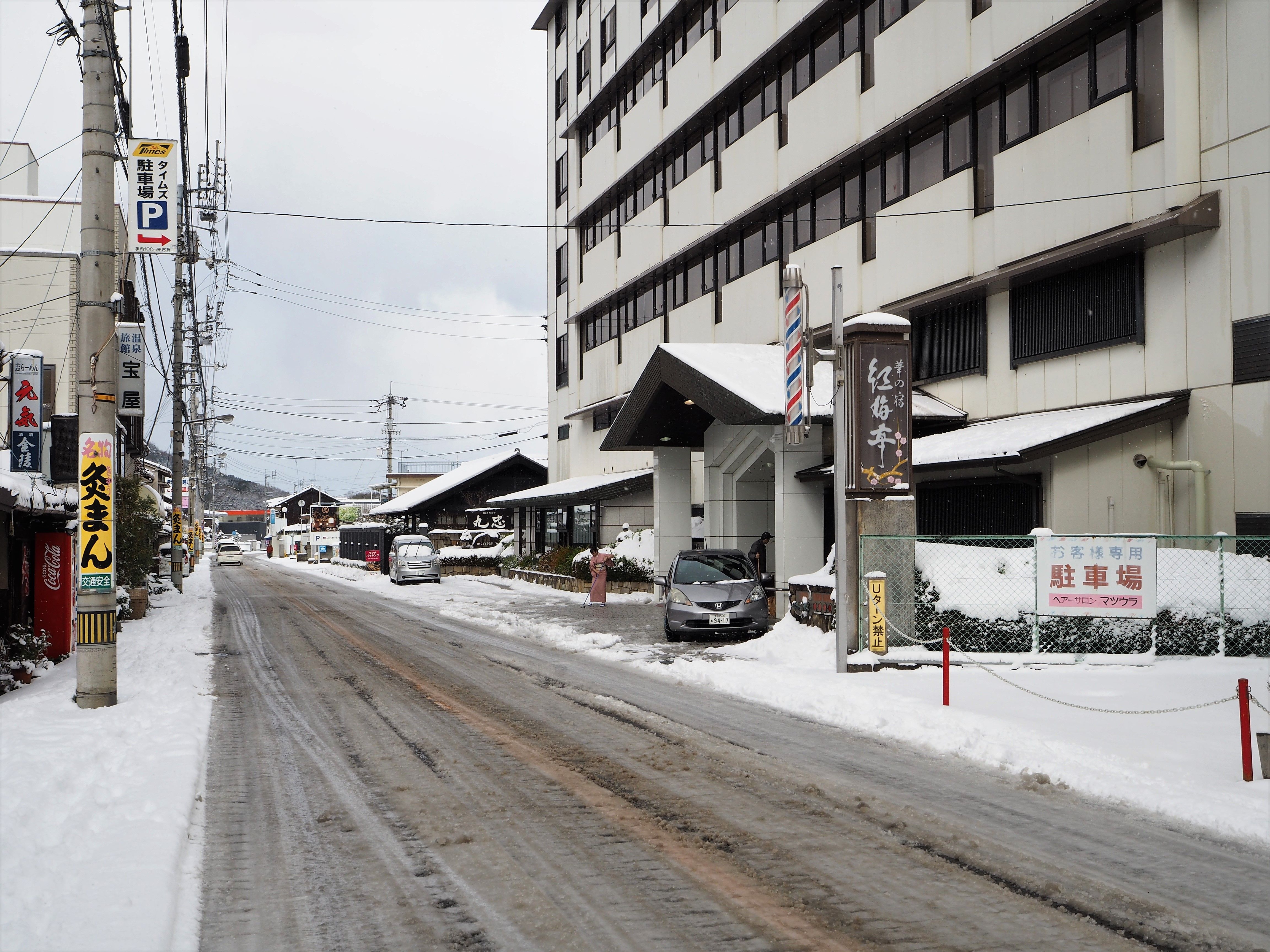 温泉を出た後参道の入り口あたりまで行ってみようかとも思いましたが、雪で道路がぬかるんでいるので諦めました。