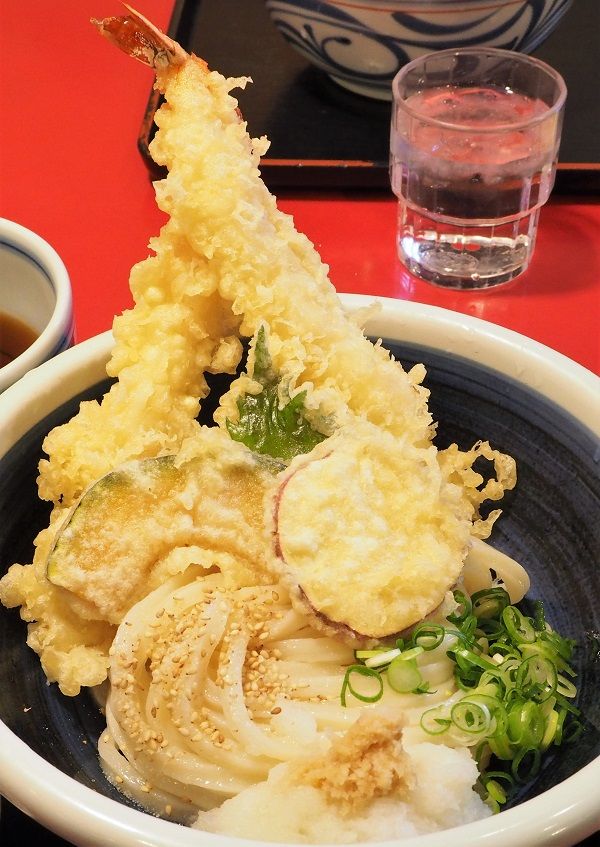 冷たい「ぶっかけうどん」の上に海老2本と野菜てんぷらと大根おろしが乗ったボリュームのあるうどんです。
