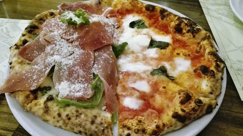 ピザは2種類のハーフ&ハーフで、「マルゲリータ」と「ルッコラと生ハム」をお願いしました。