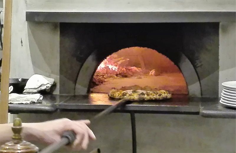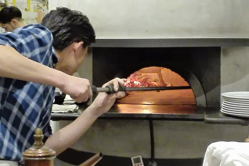薪釜の中のピザを回したり、持ち上げたりしながら仕上げていきます。