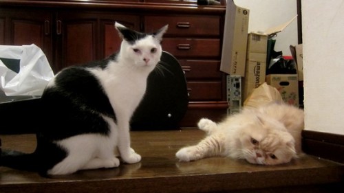 ある日帰ると階段の上で仲良くお出迎え。。癒されますなぁ… ▲モモ 1才 ▲ミル 8才