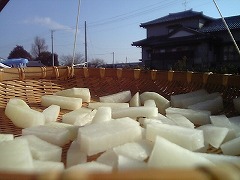 朝から晴天が広がり、3月下旬並みの気温とか。豪雪地帯の実家にも、雪は全然ないそうです。雪かきをしなくて済むからラク。道路が凍結しないので通勤が怖くない。暖房費が少なくて助かる。・・・でも、これでいいのか?もっと危機感を持たなくちゃいけないんじゃないのか?などという気持ちも、青空を見ていると消えいってしまい・・・。洗濯物を干し(冬の新潟で外に洗濯物を干せるなんて!)、お布団を干し(同上)、大根も干してみました。実家からもらってきた、父の作った大根。最後の一本は、一緒にもらってきた柚子と漬物に。半日干した大根に塩をまぶし、柚子の果汁と皮のおろしたもの、更に刻んだ皮と昆布を加えてもんでおくだけ。 できあがりました。干して水分が抜けた分、甘みとうまみの凝縮した大根。さっぱりしていておいしい。冬のお日様の味がしました。明日から、お天気は下り坂だそう。でも、雪でなくて雨マーク・・・。