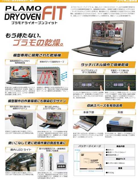 予約受付中のプラモ向上委員会プラモドライオーブンフィットちょっとお値段がなぁと悩んで居る方もいるかもですし、何より乾燥機なんて不要とお考えの方も多いかも私が乾燥機をお勧めするのは、商売的な事を抜きにしても製作の質が確実に向上するからです。これが渡しが普段使用している機械になります。既に寒くなってきましたが凍えるような寒さでも乾燥機の中は確実に設定した温度になります。塗装や接着などにおいて、常に何か一つでも環境を常に一定に揃える事により失敗を防ぐ事が出来ます。特に塗装は環境に左右されやすく、同じようにやってるのに前回と仕上がりが違うとか経験ありませんか?それは一般的な家庭環境だと室温や湿度の変化により、得られる結果に違いが生じてしまうからです。精密機器の工場などにお勤めの方はわかるかもですが、常に工場内は一定の状態を保つ努力がなされ、そうしないと条件が変わってしまい歩留まりに影響しますよね。流石にご家庭では、室内環境を一定に保つなんてのはコスト的に不可能です。なので、せめて乾燥環境だけでも常に一定に保つのは需要な事となります。プラモデル用の塗料や接着剤は、揮発硬化が主でこの揮発スピードは温度に左右されます。理屈では温度は高ければ高いほどスピードアップするのですが、室温自然乾燥では人間も生活する関係で対して高温に出来ないでも乾燥機単体ならその中を人が居られない温度に設定する事が出来る。この利点は計り知れない訳です。なになに?食器乾燥機があるから大丈夫?確かに何もないよりはマシですけどヒーター能力が低すぎて、庫内温度は周りの環境温度に影響を受けます。夏場と冬場では、全く庫内温度が違ってしまい先述した常に一定の環境とはほど遠い物となります。何よりメーカーが目的外使用は辞めて下さいとお願いしてるわけですしね。あと最高温度が低過ぎる。プラモデルに用いられるPs素材などは、70度から熱変形するとされています。50度から60度の変形手前の高温で乾燥できるドライオーブンフィットは、安全性を兼ね備えた乾燥機と言えます。塗装後の指触乾燥までなら、数十分で確実に行けるのでマスキングにも入れるしパテなら一晩とか二晩とか置かずに数時間で切削加工に入れるのも魅力塗装もパテもつかわない?でも合わせ目消しはどうですか?接着剤の乾燥硬化にも抜群の力を発揮しますので、午前中に接着した物を夜には確実に削ることが出来るのは大きな魅力ですよ。そんなわけで、置き場所問題はありますけど、それが解決できるなら確実に買い!アイテムだと私は思います。