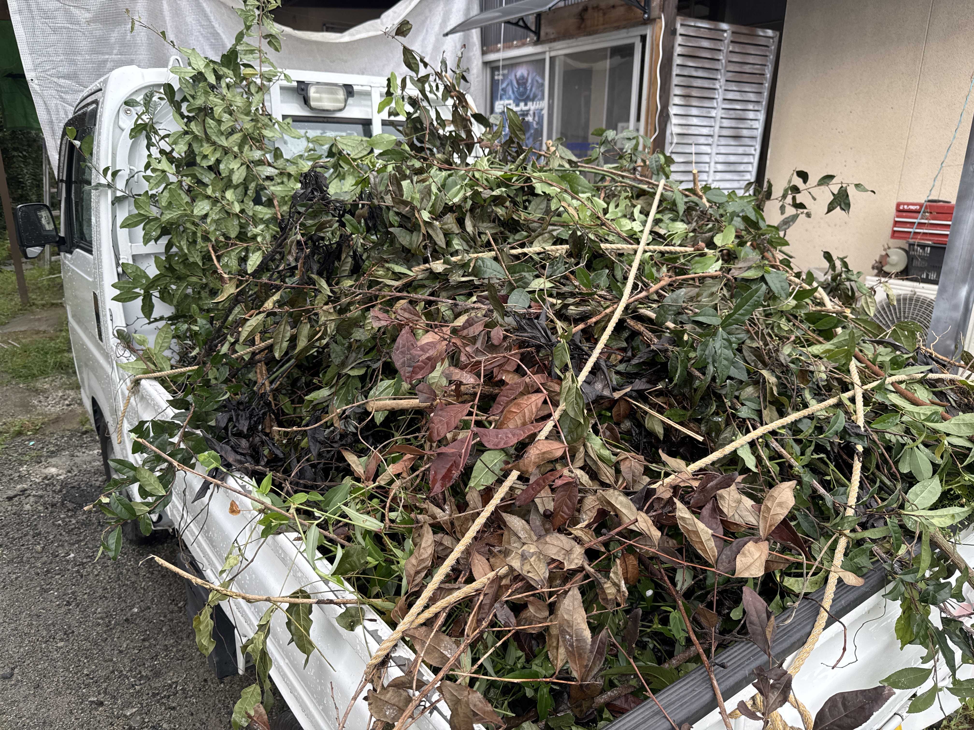 今年の夏は猛暑過ぎて、外の手入れが何もできてなくいろいろが伸び放題そこで少し気温下がってきたからと、ようやく枝などをカットしてたのです。軽トラ一台分なんてあっという間ですよ。そこまではよかった。鬱蒼しげる枝をカットしてたら、何かが一切に飛び立って来た。あぶねー蜂の巣があるやんか!こんな事も有ろうかと我が家には常にハチジェットを完備してるので2本フル噴射し、ある程度は追い払ったけどさて、どうしたものか?とりあえず、叩き落として壊さないとだけどハチを殲滅できた訳じゃない周りが解放スペース過ぎて煙幕も効かないだろしこれからどうするか検討します。