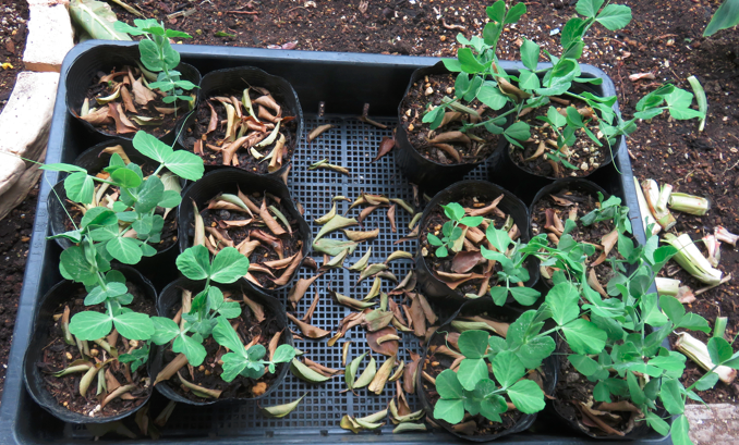 絹さやエンドウを6ポット、スナップエンドウの種も6ポット。1つのポットに3粒づつ蒔…