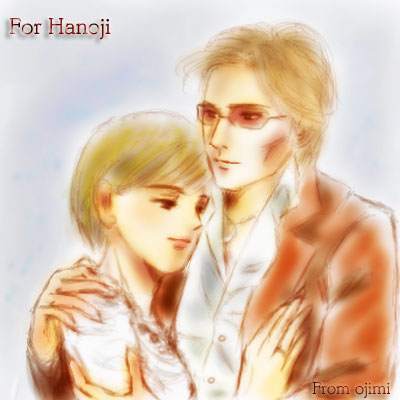 お早うございます、hanojiさん!お約束していた石様×奈美悦子ばり栗色ショートヘアなイメージのhanojiさんです。どうでしょうかね~、似てますか(笑)?ちょっと三人の芸能人の顔をミックスして3で割るという高等技術は持ち合わせていないので、もう顔は脳内イメージで描かせていただきました。ごめんね。(一応検索して調べたけども合体不可能でした…笑)石様は素敵な写真ご紹介していただけたので、描くのが楽しかったですよ♪(基本的に模写は苦にならない人)ぎゅぎゅっと抱き締められて、うっとり昇天してるような妄想にしてみました。あ、もっとハードなのがよかったですかね(笑)?ハードな絡みでしたら、一枚500円ぐらい頂いたら描きますけども(注:冗談です)。最近ちとバタバタしていて、ざっくりとしたオエビ絵しか描けずほんと申し訳ない。以前ひよこよさんに描いた時はちゃんとフォトショップで描いたんですが…。私はダイエットやリバウンド防止日記の方は現在休止状態ですが、カラダスキャン君のお告げは毎日聞いておりますし、万歩計クンとも日々仲良く暮らしておりますよ~。(ちなみに昨日は久しぶりに一万歩近く歩きました♪)食欲の秋到来してからがコワいですよね。リバウンド。そんなことにならぬよう食べすぎに注意し、できるだけ歩くことを心がけながらこれからも頑張っていきますね!hanojiさんも、お仕事に、ダイエットに、お料理に、そしてもちろんあの方への愛を高らかに叫びつつ(そう、ここが一番重要っすよね!!萌え魂!)、ナイスバディのキープ頑張って下さいね!!応援しております!!最後になりましたが、2~8月の半年間、私のダイエットを愛溢れるコメントの数々でずっと応援していただき、有り難うございました。ひとえにあのテンションを半年維持できたのはhanojiさんのおかげだと言っても過言ではありません(笑)。大変楽しかったです♪実際にお会いしてこの感謝の気持ちをお伝えしたかったのですが、機会がなく残念に思っておりました。こうした形で、ほんの少しでも謝意を表す機会をいただけて本当に嬉しいです。拙い絵ですがご笑納くださいませ。大好きなhanojiさんに、これからもたくさんのhappyが訪れますよう、千葉よりお祈りいたしておりますね!「い○○ち」ことojimiでした!(おまけの呟き)ほんまに一枚500円ぐらいで、こういう商売でけへんかなあ…(笑)。好きな芸能人とのツーショット、あるいは似顔絵等モデル写真さえいただけたらなんぼでも喜んで描くんですが♪このレベルで500円はぼったくりか…(笑)。人気blogランキングへ↑ブログランキング参加中。ますます励みになるので、よろしければポチっと投票願います。