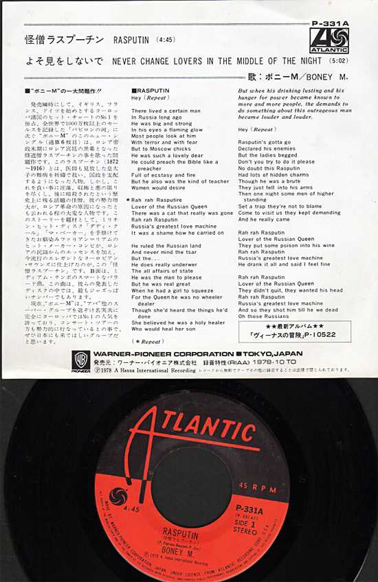 A面「Rasputin」(邦題「怪僧ラスプーチン」) 作詞・作曲 Frank Farian、Fred Jay、George Reyam