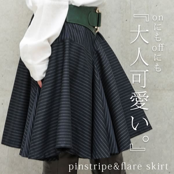 オンにも、オフにも大人可愛い。『ピンストライプ&フレアスカート』【レディース ボトムス スカート フレア 膝丈 膝下丈 ピンストライプ】【メール便不可】