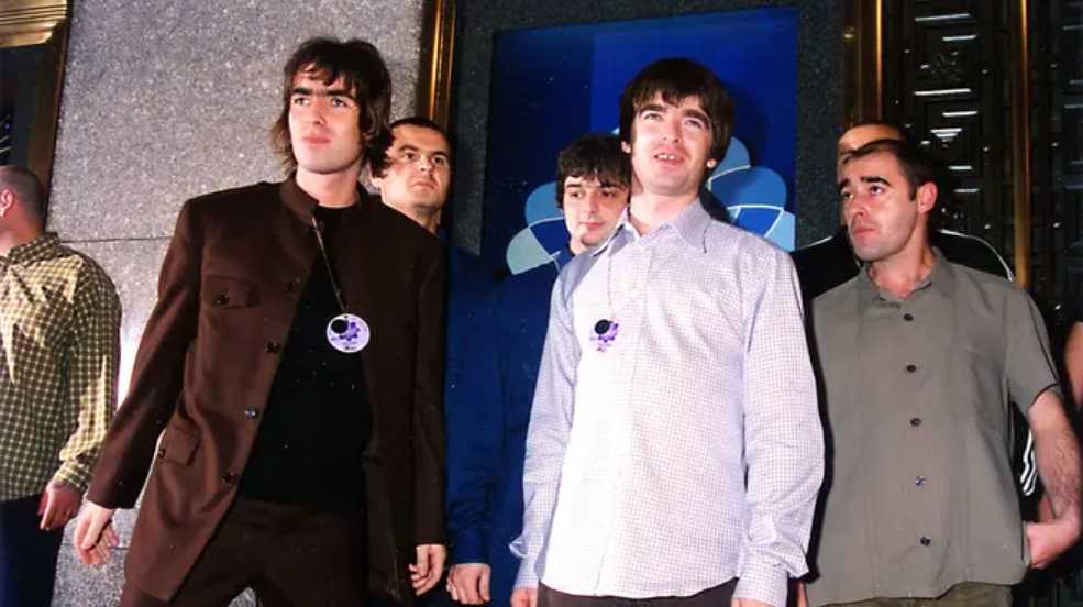 ポーズを取っており、オアシスの美学の象徴となった労働者階級のクールさを体現している。